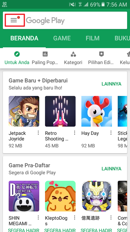 Jika, kau ingin mengganti aplikasi launcher yang sedang kau gunakan dengan aplikasi launcher bawaan Android dan sekaligus menghapus aplikasi launcher tersebut. Kamu dapat mengikuti langkah-langkah dibawah ini:1. Buka aplikasi Play Store, kemudian klik ikon yang dikotaki warna merah.